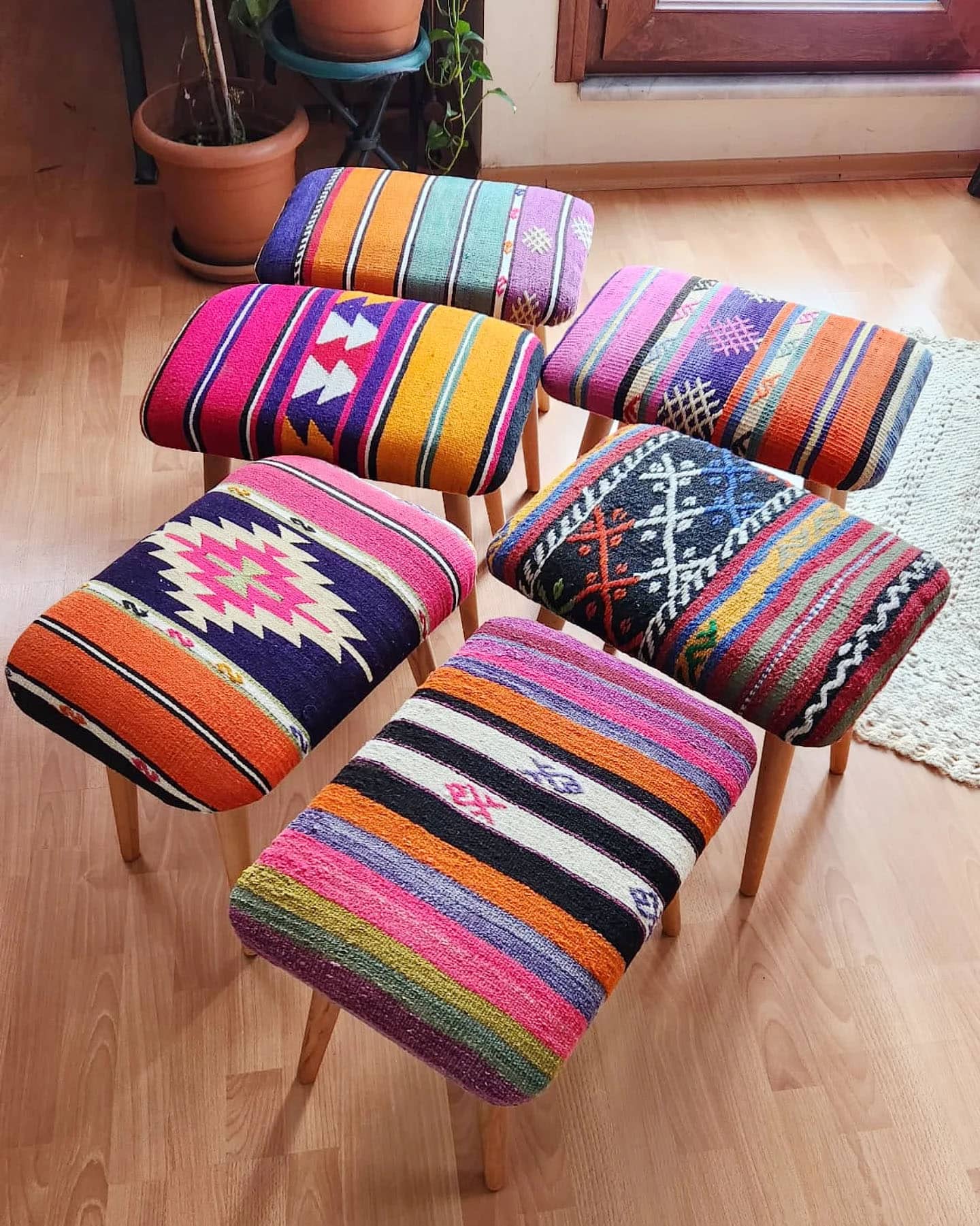 The fourth photo reimagines the first nook, this time revealing more of the rugs' dialogue. The contemporary rug in gold and green now shares space with a second rug—this one an ethnic flat-weave from the 1950s, bearing a galaxy of Anatolian "star" motifs. The pairing is unexpected yet symphonic. Each piece holds its own, while together they build visual depth and narrative continuity. This is what living with art looks like: functional, beautiful, and intimately personal.